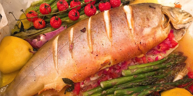 Whole Roasted Artic Char with Asparagus and Tomato