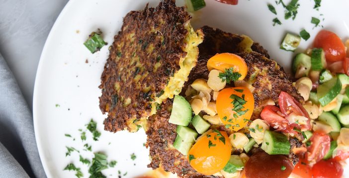 Pan Fried Cauliflower Fritters with Tomato, Cucumber and Chickpea Chop