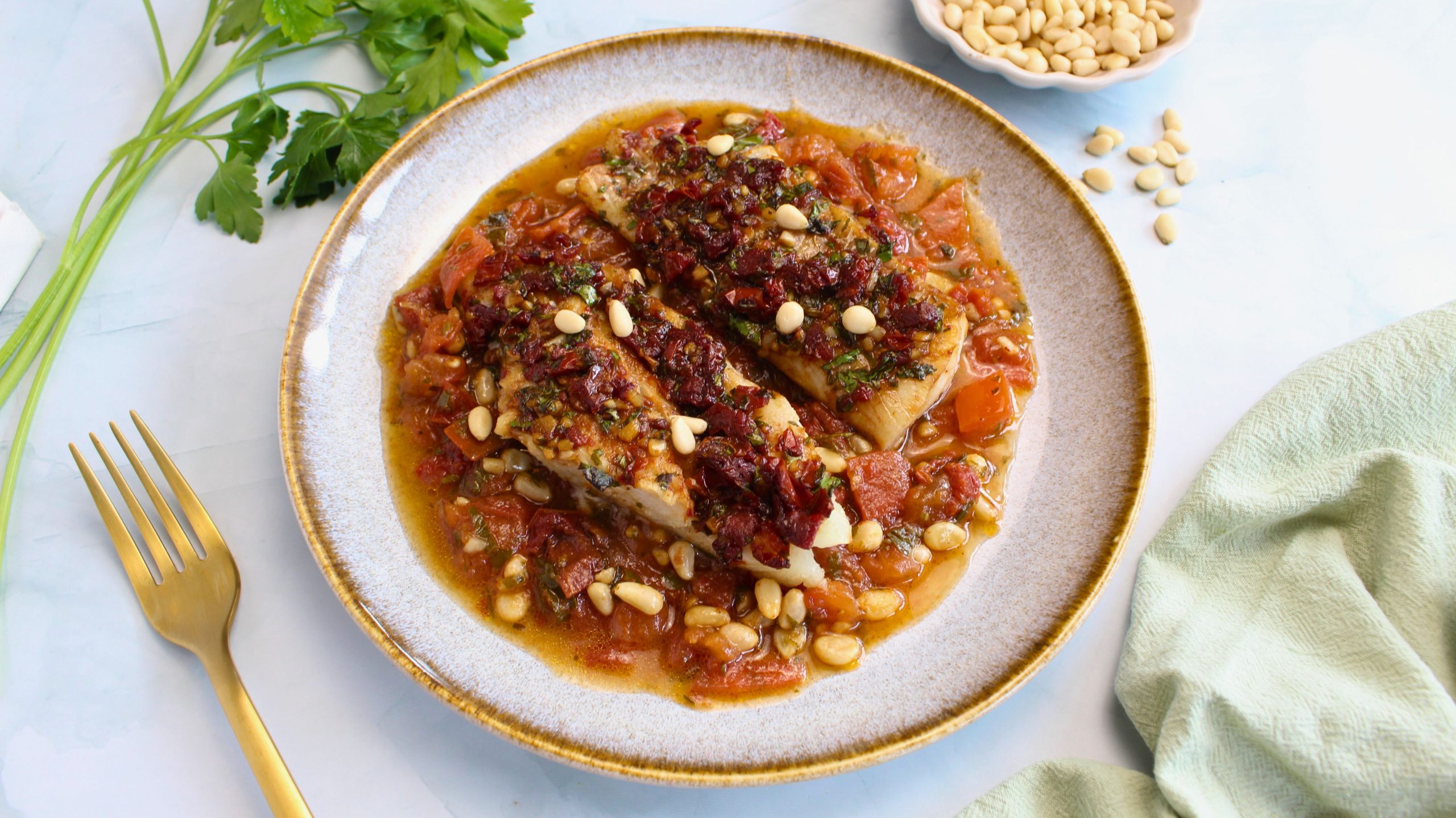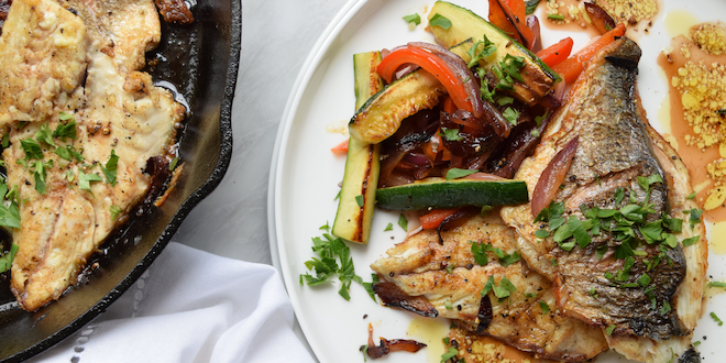 Broiled Mediterranean Sea Bass with Sun Dried Tomato Coulis
