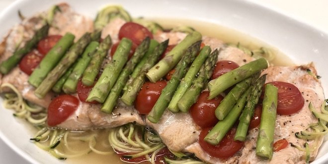 Baked Salmon Trout with Zucchini noodles & Asparagus