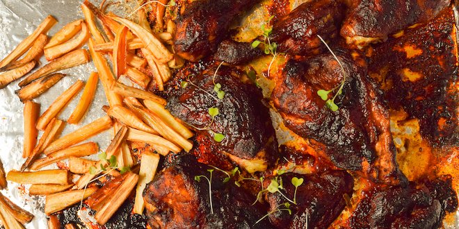 Roasted Sheet Pan BBQ Chicken with Parsnip “Fries”