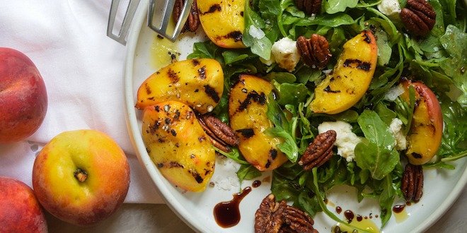 Grilled Peach & Arugula Salad with Goat Cheese and Pecan
