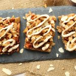 While the squares are cooling, prepare the topping by whisking together the Greek yogurt, peanut butter, and cinnamon until well combined and a mousse is formed. Add mixture to a piping bag or ziploc bag with the corner tip cut off. Gentle squeeze the yogurt peanut butter mousse to each square. Serve and enjoy!