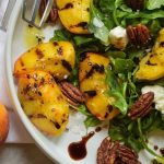 For the Salad: Place the arugula in a large bowl or platter, drizzle with balsamic vinegar, olive oil, salt and pepper. Toss until well combined. Add the pecans, crumbled goat cheese and grilled peaches (1/2 grilled peach per serving).
