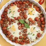 In an oven-safe skillet or baking dish, toss the halved cherry tomatoes with olive oil, garlic, dried basil, salt, and pepper. Spread them evenly in the pan.