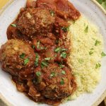 Serve the Moroccan meatballs over 3/4 cup of couscous, garnished with fresh cilantro. Accompany the dish with roasted veggies or a green salad for a complete, balanced meal.