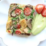 12 egg, ½ cup milk, ½ cup red onion, 2 cups mushroom, 2 cups spinach, 1 cup cherry tomato, 2 slices bread, ¼ tsp salt, ¼ tsp pepper, 1 tsp paprika