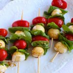 12 cherry tomato, 12 mozzarella cheese, 12 leaves basil, 12 leaves arugula, 6 small wooden skewers