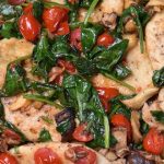 Add the garlic to the pan, and cook until lightly browned. Add the tomatoes, season with a pinch of pepper, add the spinach, and sauté until wilted. Add this mixture to the dish with the chicken.