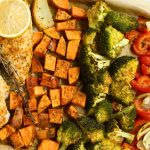 Arrange sweet potato, broccoli florets, red bell pepper, onion, and chicken breasts on a large sheet pan lined with parchment paper or aluminum foil.