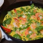 1 coconut milk, ¼ cup water, 1 lime, ½ tsp red chili flakes, 3 shakes tabasco, 1 bunch basil, 2 handfuls spinach