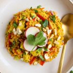 This vibrant and colourful curried grain salad is made with quinoa, crunchy veggies, chopped apple, and paired with a tangy curry dressing.