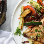 Heat a non-stick fry pan to medium-high heat. Add 1 tbsp extra virgin olive oil. Add the red bell pepper, red onion, and zucchini to the pan, toss to coat, and sprinkle with salt and pepper. Cook for about 10 minutes or until the veggies are fork tender and browned on the edges. Remove to a plate, cover with foil to keep warm.