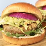 Toast buns if desired. Spread spicy yogurt sauce on the bottom half. Layer greens, grilled chicken, avocado slaw, and red onion slices. Add the top bun.