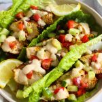 On serving plates, spoon the chicken slices in the lettuce cups, add some of the Chopped Salad to the lettuce with the chicken and drizzle a tablespoon or so of Tahini Sauce over the salad and chicken.