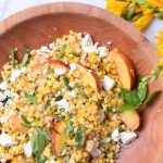 In a large mixing bowl, toss together the corn kernels and nectarine slices/pieces. Drizzle with half of the dressing and gently toss. Fold the herbs and cheese through the salad.