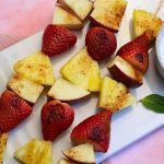 Serve the grilled fruit kabobs warm with the yogurt dip on the side.