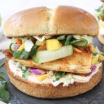 Toast the buns if desired. Spread spicy yogurt sauce on both halves, layer with fish, then top with mango slaw. Add cucumber slices, top with bun and enjoy!