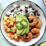 Begin to assemble the jerk shrimp bowl by adding ¾ cup of the rice & bean mixture to the bowl, top with ½ cup of the jerk shrimp and ½ cup of the pineapple salsa.