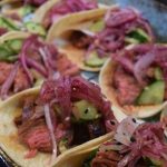 Slice thinly on an angle, serve a few pieces on soft corn tortillas, topped with Cucumber Salad, Sumac Pickled Onions and cubed avocado.