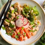 Begin to assemble bowls by adding quinoa as the base. Arrange the chicken on top, along with the carrot, cucumber, radish, cilantro, and green onion. Sprinkle with sesame seeds and drizzle with 1 tablespoon of sriracha mayo. Serve and enjoy!