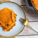 Preheat the oven to 350F. Carefully spoon the sweet potato mash on top of the lentil mixture, and using a fork or large spoon spread into an even layer.