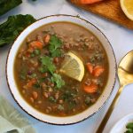 Add the stock and water and bring to a boil (uncovered). Turn heat to low and let simmer uncovered until the lentils are tender, about 45 minutes. At this point, you can puree some of the soup for texture. Put the pureed part back in the pot and carry on with step #5.