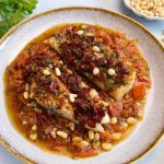 When ready to cook the fish, remove the hot baking sheet from the oven, spray with non stick spray and lay the fish, skin side down on the hot sheet. Gather the remaining marinade ingredients and evenly distribute them on top of the fillets. Broil the fish for 5 mins. Remove from the oven, place on a platter and spoon the warm coulis over the center of each fish fillets.