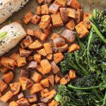 After 10 minutes, remove the sheet pan from the oven. Push sweet potatoes to one side and add the salmon fillets and broccolini.