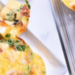 Divide cheese, spinach and red peppers between the 12 muffin cups, then evenly fill with the beaten eggs.