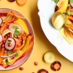 To a mixing bowl, toss carrots, radishes, cilantro, almonds, red onion, and pomegranate seeds.