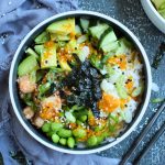 Prepare sushi bowl by portioning brown rice (⅓ cup each), salmon, cucumber, avocado and edamame.