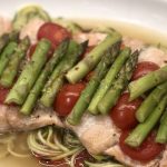 Distribute the remainder of tomatoes, red chili rounds and all the asparagus spears on top of the fish.