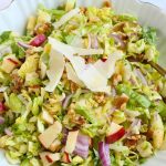 To the shredded Brussels sprouts, add the walnuts, apples, and red onion. Toss everything together to combine.