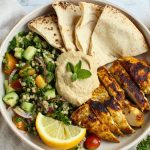 Grill the chicken breasts for about 6-7 minutes per side, or until they are cooked through and have nice grill marks. Remove from the grill and let them rest for a few minutes before slicing them thinly. Serve with tabbouleh salad, warmed whole wheat pita, and a dollop of hummus.