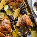 Place the olives, lemon wedges and red onion wedges on the sheet.