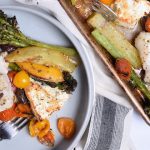 After the 25 minutes, remove the potatoes from the oven and nestle the fish in and around them. Scatter and nestle the broccolini and tomatoes around the fish and potatoes. Then place the feta in the empty spots.