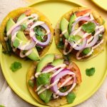 Top each smash burger patty with shredded lettuce, sliced tomatoes, sliced red onion, and sliced avocado. Using a spoon or a piping bag, drizzle the spicy yogurt sauce on top of each taco and garnish with cilantro.