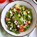 1 head lettuce, 1 tomato, ½ cucumber, ½ cup chickpeas, ½ cup green onion, ½ cup peas, ¼ cup mint, ½ cup feta cheese