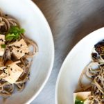 In the meantime, cut the tofu into 1-inch cubes. In a shallow dish, mix the apple cider vinegar, tamari, water, oil, and sesame seeds. Place the tofu cubes into the shallow bowl with the marinade. Allow to marinate while you cook the soba noodles.