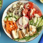 To a serving bowl, layer arugula and quinoa and top with cucumber, cherry tomato, carrot, avocado, radishes, and cooked tofu cubes. Drizzle with tahini dressing and enjoy!