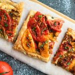 Layer sliced tomatoes on top of the ricotta and tapenade leaving a 1 inch border around the edge of the puff pastry.