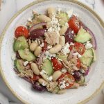 ¾ cup cucumber, ½ cup cherry tomatoes, ¼ cup red onion, 2 tbsp Kalamata olives