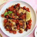 Return the pan to the stovetop over high heat and add the remainder of the oil. Add the fish to the pan, flesh side down (if there is skin on the fish). Sear the fish on one side for 2-3 minutes. Flip the fish to the second side and cook for 1-2 minutes. Add the tomato mixture back to the pan and place the pan in the oven for 10 minutes or until the fish flakes. Serve hot.