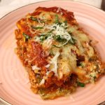 Place zucchini slices on paper towel or a cool rack, and lightly salt both sides. This process will extract excess moisture out of the zucchini to allow for a firmer zucchini layer in the lasagna. Let sit for 10 minutes, and blot excess moisture and salt with a paper towel.